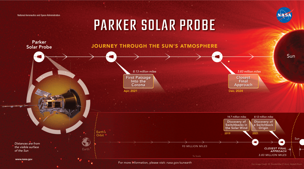 In August 2018, NASA's Parker Solar Probe* (PSP) began its long journey to study the Sun's outer corona. After several gravity-assist maneuvers with Venus, the probe broke Helios 2* 's distance record and became the closest object to the Sun on October 29th, 2018. Since then, the Parker probe's highly elliptical orbit has allowed it to pass through the Sun's corona several times ("touch the Sun"). On December 24th, 2024, NASA confirmed that their probe made its closest approach to the Sun, passing just 6 million km (3.8 million mi) above the surface - roughly 0.04 times the distance between the Sun and Earth (0.04 AU).