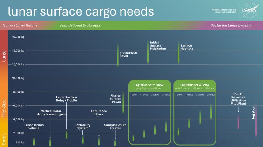 In sum, NASA predicts that future demands for cargo will range from 2,500 to 10,000 kg (~5,510 to 22,045 lbs) a year for annual recurring logistics. They also predict that occasional large cargo deliveries (rovers or habitation modules) of up to 15,000 kg (33,070 lbs) could occur during the Foundational Exploration campaign segment. The "Lunar Mobility Drivers and Needs" white paper, part of the 2024 Moon to Mars Architecture series, provides a detailed breakdown of the logistical requirements.