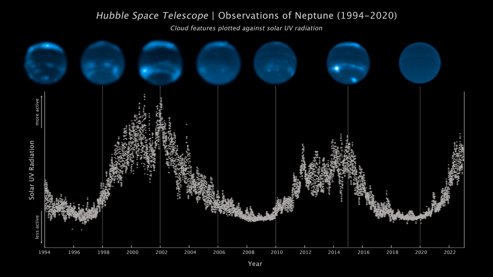 "The clear positive correlation we find between cloud activity and Solar Lyman-Alpha irradiance lends support to the theory that the periodicity in Neptune's cloud activity results from photochemical cloud/haze production triggered by Solar ultraviolet emissions," the team wrote.