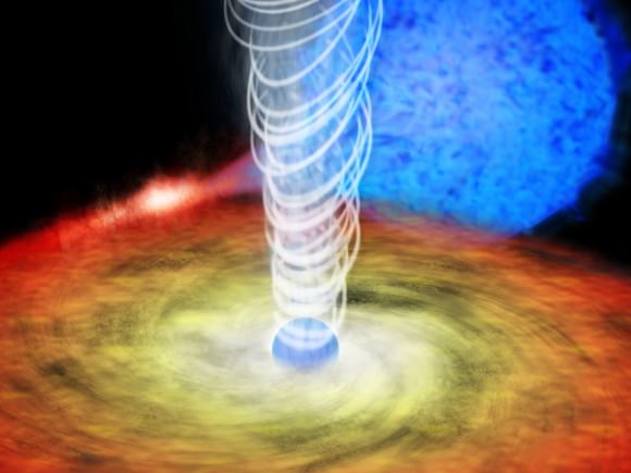 The system is a pretty young member of the X-ray-binary class of objects. Typically, a binary pair consists of a black hole and a sun-like star, or a neutron star and a sun-like star. The tremendous gravity of the more massive member of the pair continually pulls material from the companion. Eventually, a hot disk of gas forms and spirals down to the surface of the neutron star. This accretion process unleashes huge amounts of energy, and some of it powers the jets. They carry material away from the system at close to the speed of light.