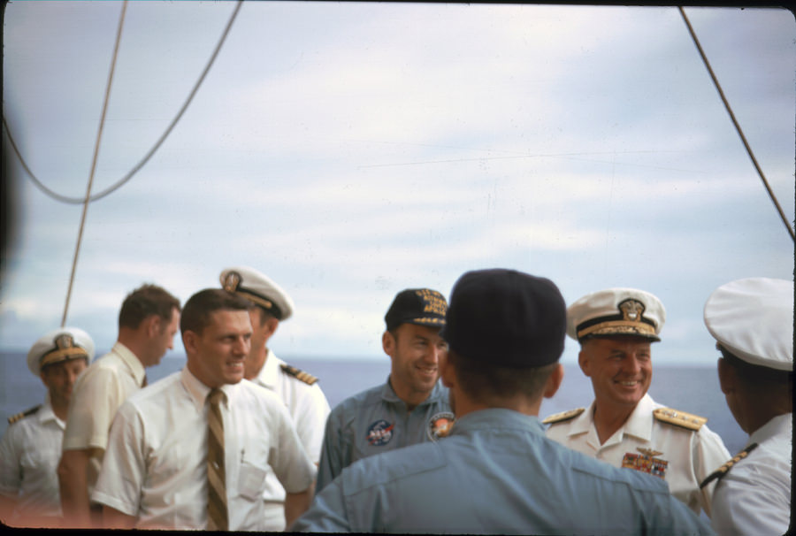 [caption id="attachment_62971" align="aligncenter" width="385" caption="Haise and Lovell emerge on deck for helicopter ride to American Samoa. Image courtesy Robert Gillette."]