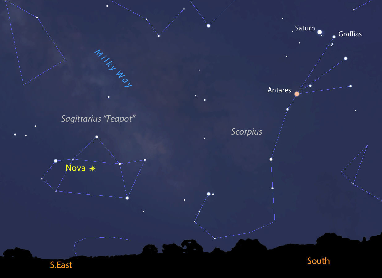 A 5th magnitude nova's not too difficult to spot with the naked eye from a dark sky, and binoculars will show it with ease. Make a morning of it by setting up your telescope for a look at Saturn and the nearby double star Graffias (Beta Scorpii), one of the prettiest, low-power doubles in the summer sky.