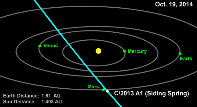 NASA's Near-Earth Object Office says that new observations of comet C/2013 A1 (Siding Spring) have allowed further refinements of the comet's orbit, helping to determine the chances it could hit Mars in October of 2014. Shortly after its discovery in December 2012, astronomers thought there was an outside chance that a newly discovered comet might be on a collision course with Mars.