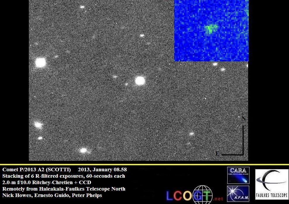 , issued on 2013, January 08, announces the discovery of a new comet (discovery magnitude 19.5) by J. Scotti with the 691 Steward Observatory, Kitt Peak, on images obtained with the 0.9-m f/3 reflector + CCD on January 06.2. The new comet has been designated P/2013 A2 (SCOTTI).