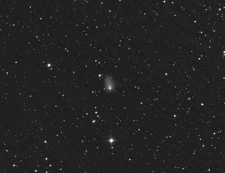Comet Jacques exhibits a dense, fairly bright 2-arc-minute coma or cometary atmosphere with a short northward-pointing tail. Brightness estimates have been hard to come by, but it appears the comet may be around magnitude +11.5 - 12 or within range of an 8-inch (20-cm) or larger telescope. One thing's for certain. In the coming weeks, E2 will be approaching both the Earth and the sun and brightening as it slowly gains altitude in the evening sky.