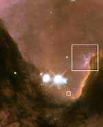 In the box at upper right, a jet of material is seen being ejected from a very young, low-mass star. The jet, extending to the lower right of the box, protrudes from the head of a dense pillar and extends three-quarters of a light-year out into the surrounding thin gas. The jet's source is a very young stellar object that lies buried within the pillar. Previous Hubble images of the Trifid Nebula, taken in 1997, show very small, but noticeable changes in the knotty material being ejected from this jet. Accompanying the jet is a nearby stalk that points directly toward the central stars in the Trifid Nebula. This finger-like stalk is similar to the large pillars of gas in the well-known Eagle Nebula, also imaged by Hubble.