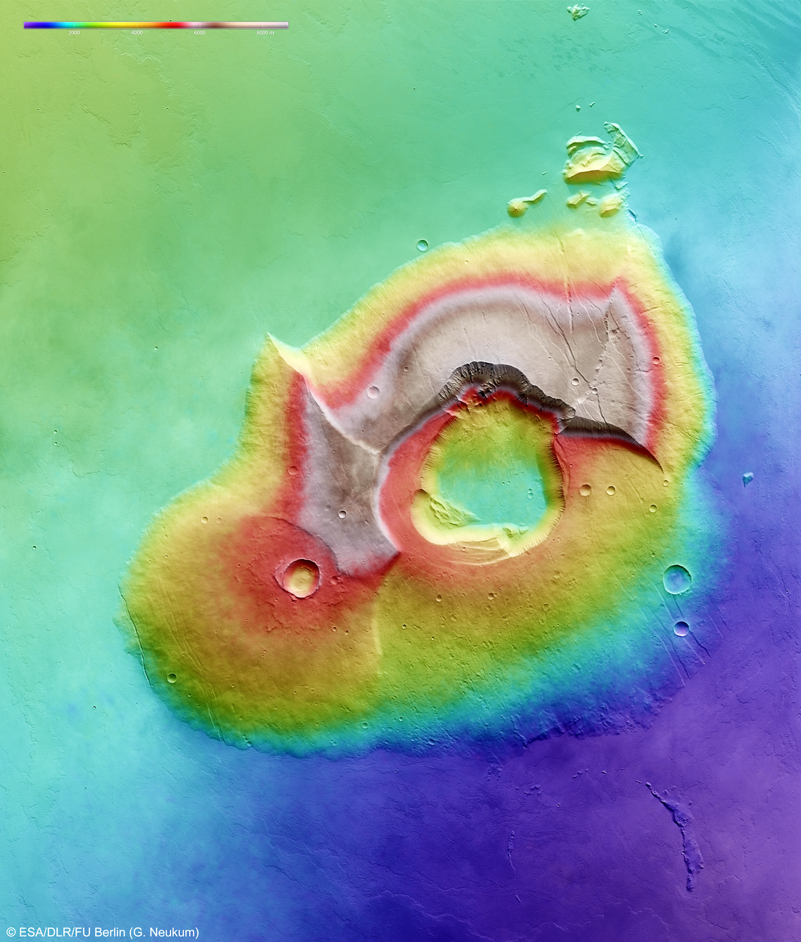 [caption id="attachment_90849" align="aligncenter" width="580" caption="This image was created using a Digital Terrain Model (DTM) obtained from the High Resolution Stereo Camera on ESA's Mars Express spacecraft. Elevation data from the DTM is colour coded: purple indicates the lowest lying regions and beige the highest. Image Credit: ESA/DLR/FU Berlin (G. Neukum)"]