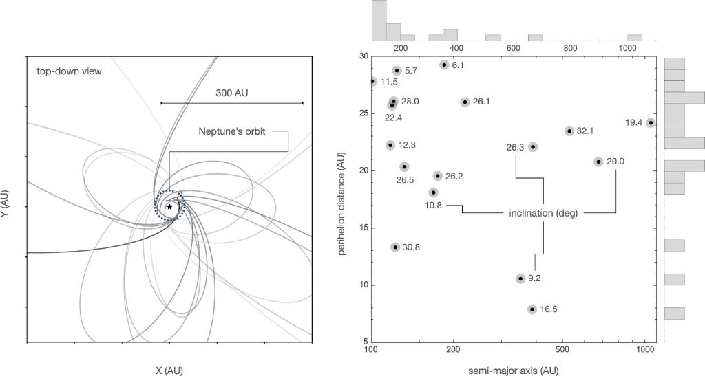 29 objects in the Minor Planet Database have well-characterized orbits with a > 100 au, inclinations < 40°, and q (perihelia) < 30 au. Of those 29, 17 have well-quantified orbits. The researchers focused their simulations on these 17.