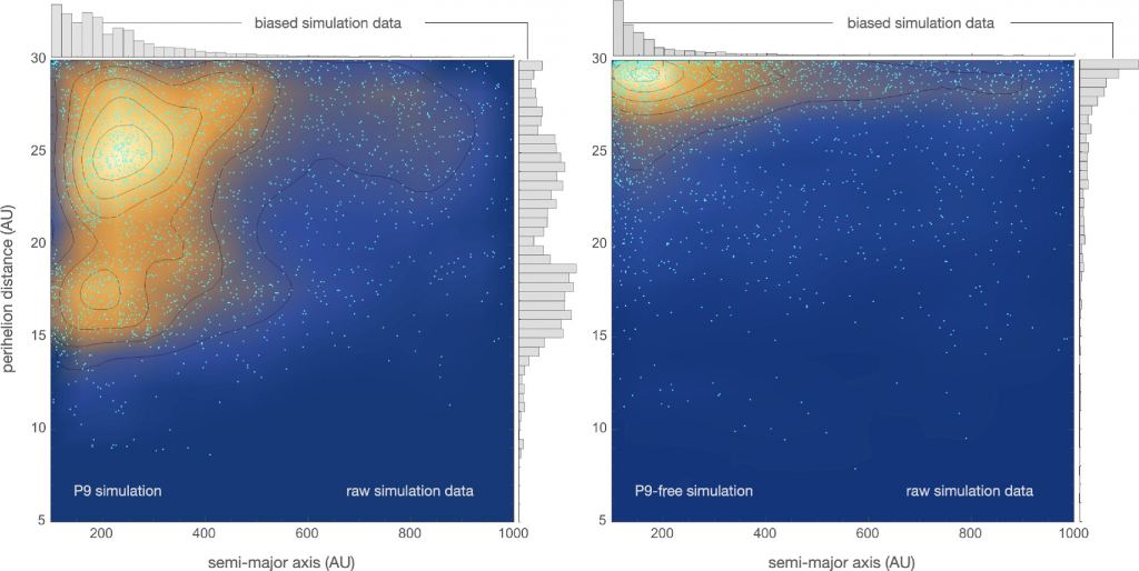 The simulations began at t =300 million years, meaning 300 million years into the Solar System's existence. At that time, "intrinsic dynamical evolution in the outer solar system is still in its infancy," the authors explain, while enough time has passed for the Solar System's birth cluster of stars to disperse and for the giant planets to have largely concluded their migrations. They ended up with about 2000 objects, or particles, in the simulation with perihelia greater than 30 au and semimajor axes between 100 and 5000 au. This ruled out all Neptune-crossing objects from the simulation's starting conditions. "Importantly, this choice of initial conditions is inherently linked with the assumed orbit of P9," they point out.