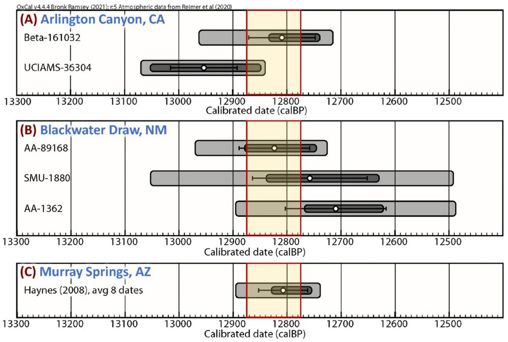 *This figure shows the calibrated ages of the YDB layer at the three sites. "All dates for the three sites overlap the predicted age range, supporting a synchronous YDB age within radiocarbon uncertainties of 68.3% and 95.4% Confidence Interval (CI)," the authors write. Image Credit: Kennett et al. 2025. PLOS One*