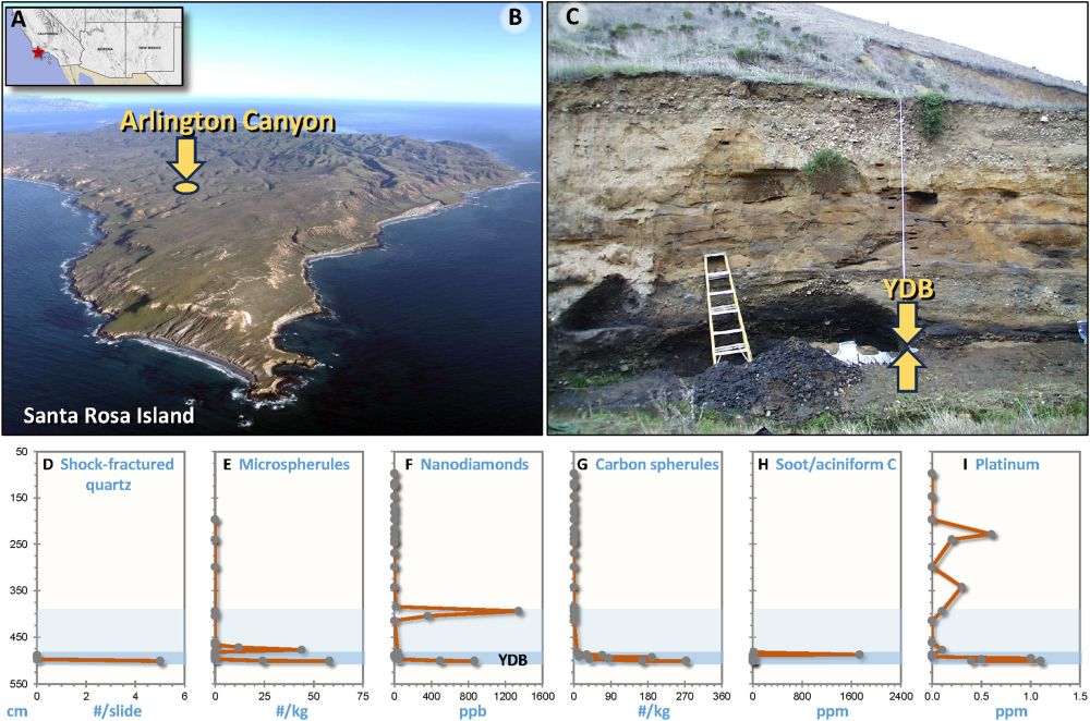 *This figure summarizes the stratigraphic context and proxy evidence for a potential Younger Dryas impact event near Arlington Canyon, a well-dated coastal site on Santa Rosa Island. The yellow arrows in C show the Younger Dryas Boundary. The researchers found the shock-fractured quartz, and previous research found the other evidence. The Kennett and his co-authors point out that the abundances of all the evidence are significantly higher than background sources. Image Credit: Kennett et al. 2025. PLOS One*