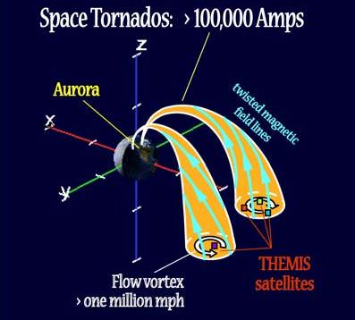 [/caption] If you think tornadoes on Earth are scary, newly found "space tornadoes" sound downright horrifying. But they are likely the power source behind the beautiful Northern and Southern Lights. A new finding by a cluster of five space probes – the THEMIS, or Time History of Events and Macroscale Interactions during Substorms show that electrical funnels which span a volume as large as Earth produce electrical currents exceeding 100,000 amperes. THEMIS recorded the extent and power of these electrical funnels as the probes passed through them during their orbit of Earth. Ground measurements showed that the space tornadoes channel the electrical current into the ionosphere to spark bright and colorful auroras on Earth.