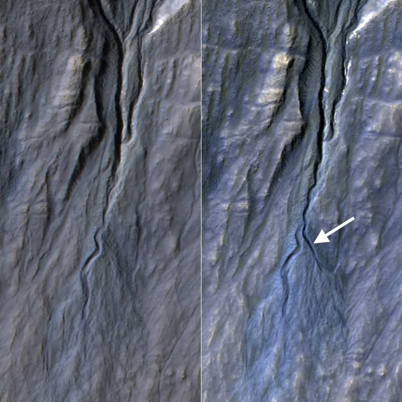 "Gully or ravine landforms are common on Mars, particularly in the southern highlands. This pair of images shows that material flowing down from an alcove at the head of a gully broke out of an older route and eroded a new channel," NASA stated.