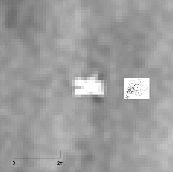 This is a zoomed in image of the Beagle 2 on Mars, with a to-scale sketch of the Beagle 2 super-imposed beside it. Credit: NASA/JPL-Caltech/Univ. of Arizona/Yu Tao et al/University College London/University of Leicester [/caption]
