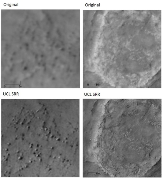 These two images show the power of the new high-resolution imaging technique. The top shows two original images, on the left a rock field, and on the right, an area containing tracks left by the Spirit rover. Image: Credit: NASA/JPL-Caltech/Univ. of Arizona/Yu Tao et al/University College London