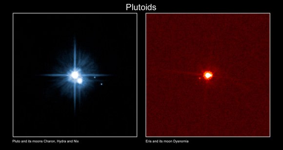 Pluto and moons Charon, Hydra and Nix (left) compared to the dwarf planet Eris and its moon Dysnomia (right). This picture was taken before Kerberos and Styx were discovered in 2011 and 2012, respectively. Credit: International Astronomical Union[/caption]