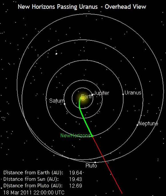 The Pluto-bound New Horizons spacecraft will fly by another planet today (March 18, 2011). However, the robotic craft won't be taking any images as it zooms past Uranus' orbit at about 6 p.m. EDT, 3.8 billion kilometers (2.4 billion miles) away from the gas giant (and 2.0 billion km (1.8 billion miles) from Earth). New Horizons is currently in hibernation mode, and the great distance from Uranus means any observations wouldn't provide much as far as data and images. But, even so, this event is a 'landmark' so to speak in New Horizon's gauntlet across the solar system.