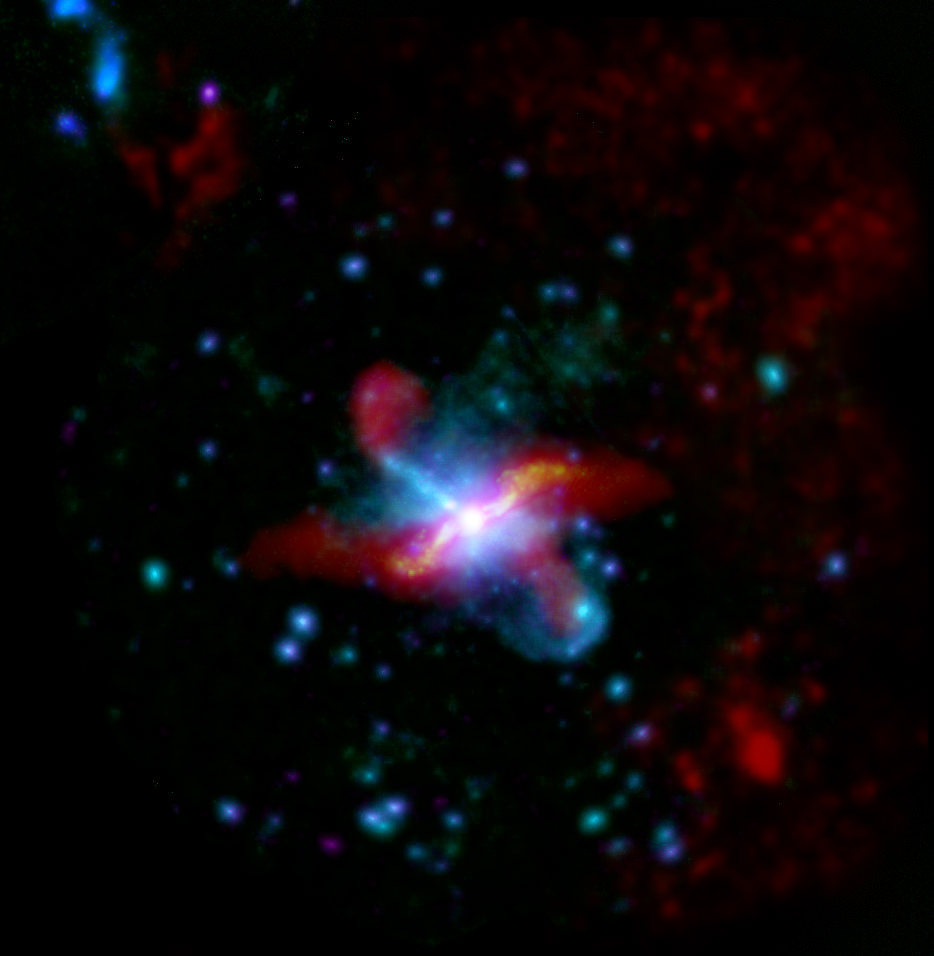 This multi-wavelength view of Centaurus A shows two massive jets of material streaming from a immense black hole in the center. When observed by radio telescopes, the jets stretch for up to a million light years, though the Herschel and XMM-Newton results focus on the inner regions.