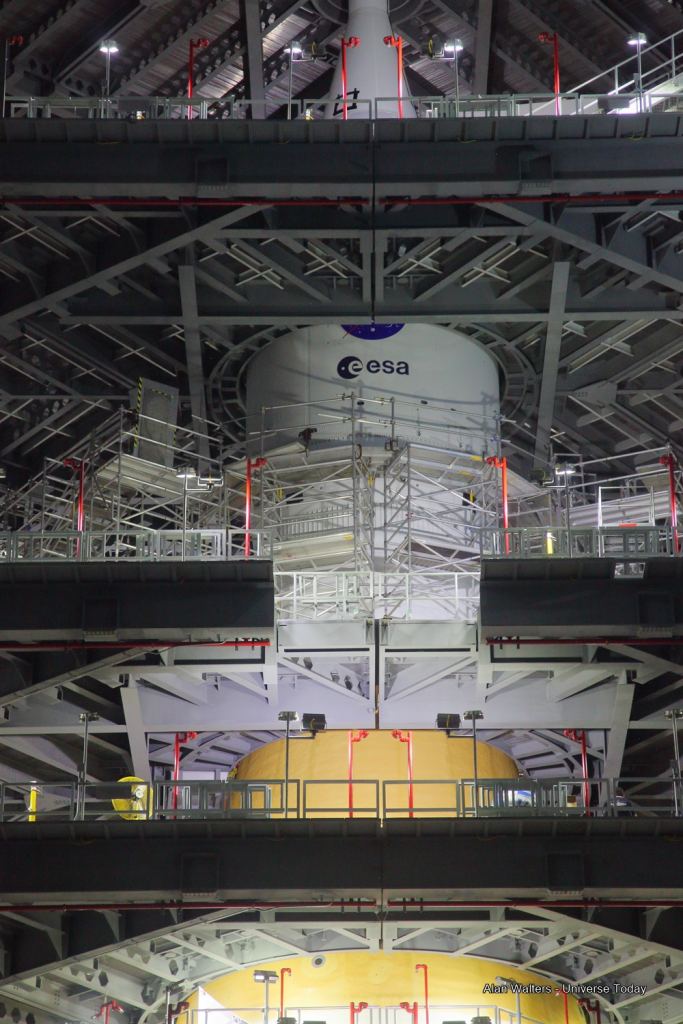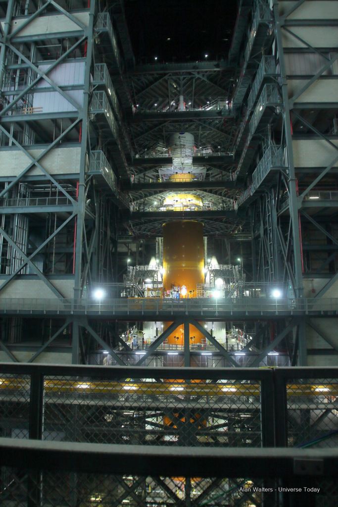 Lead image caption: The stack of the Space Launch System rocket in the Vehicle Assembly Building at Kennedy Space Center. Credit and copyright: Alan Walters, for Universe Today.