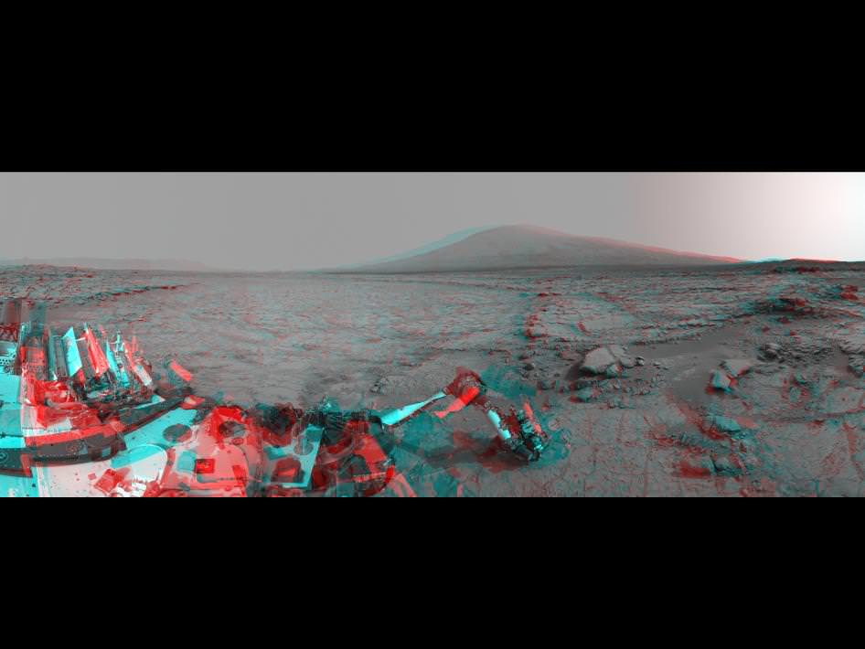 For the 3-D view above (click on it to see a larger view), use red-blue glasses with the red lens on the left. It spans 360 degrees, with Mount Sharp on the southern horizon.