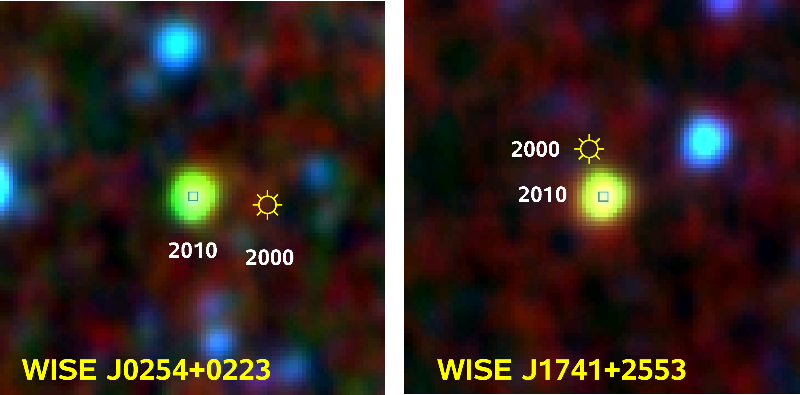 Named WISE J0254+0223 and WISE J1741+2553, the pair drew attention to themselves by their very disparity - one very bright in infrared and the other very faint in optical light. Even more attractive was the speed at which they're moving - the proper motion changing drastically between observations. "The very large proper motions are a first hint that these objects should be very close to the Sun. Both objects are only detected in the SDSS z-band which is typical of nearby late-T dwarfs." says Scholz.