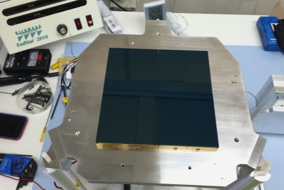 A picture of the Berkeley Lab-developed charge-coupled devices (CCDs), light-sensors that allow the Mosaic-3 camera to capture infrared light from distant galaxies. Credit: Tom Hurteau/Yale University Physics Department