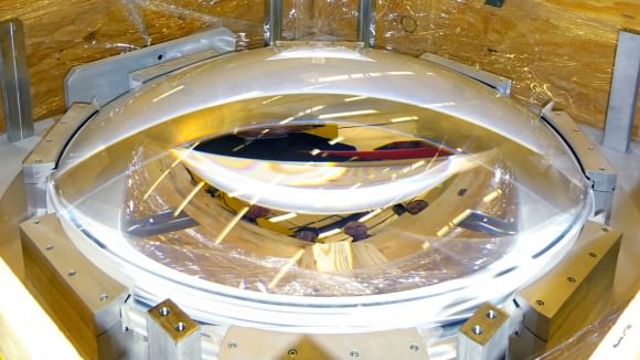 The C4 lens after it arrived at the NOAO. The faces of Gary Poczulp, Ron Probst, Dick Joyce and Ming Liang (project scientists for DESI) are reflected in the lens. Credit: Tim Miller/LBL[/caption]