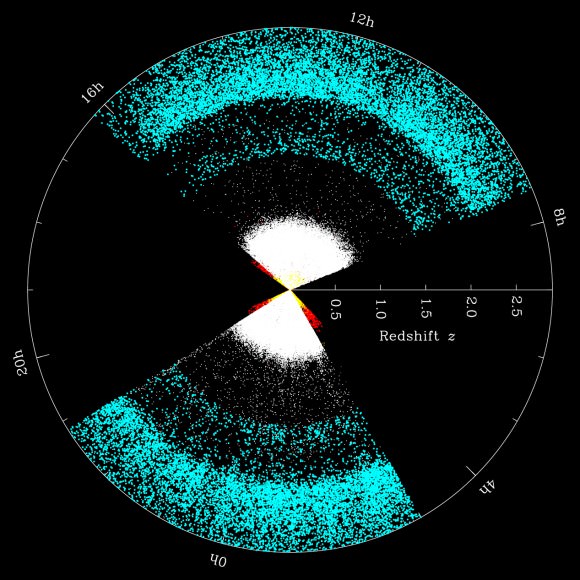Distribution of galaxies and quasars in a slice of BOSS out to a redshift of 3, or 11 billion years in the past. Credit: SDSS-III