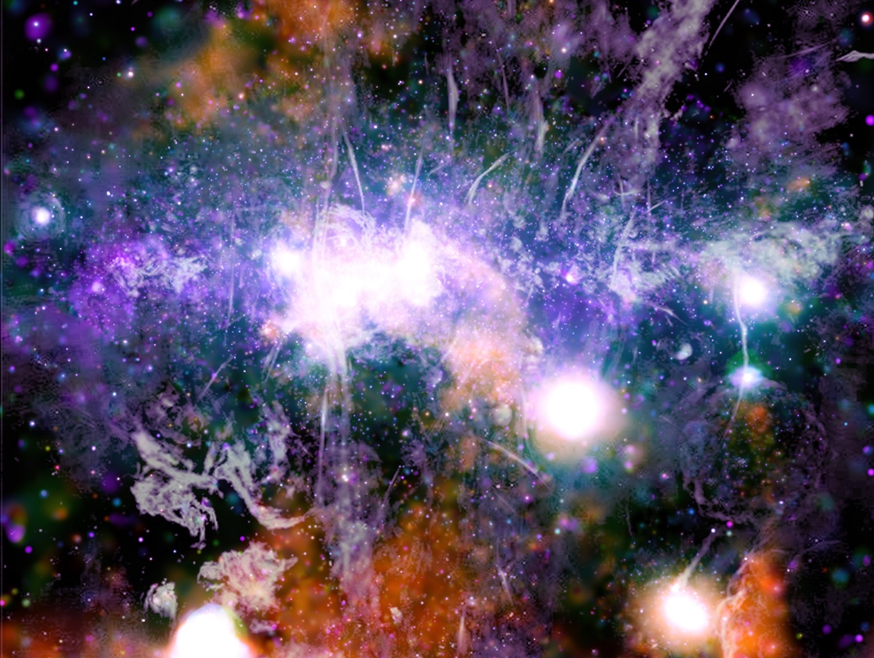 This allows particular features emanating from Galactic Center, such as radio wave filaments extending vertically and horizontally, to be fully appreciated. As you can see from the slides above (broken down by wavelength), different types of radiation are represented in different colors. The X-ray sources observed by Chandra (left) are depicted in orange, green, blue, and purple (for different X-ray energies) while radio sources observed by MeerKAT (center) are shown in lilac and gray.