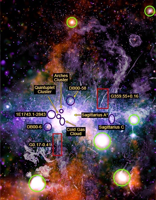 The panorama also reveals other wonders in the Galactic Center, like the Arches, Quintuplet, and other star clusters (DB00-58, DB00-6, and 1E 1743.1-28.43), the molecular cloud Sagittarius C, and the Cold Gas Cloud, all indicated in purple circles and ellipses. Be sure to check out the video below (courtesy of NASA's Chandra X-ray Center) for more details on this panorama and what it reveals about the core region of our galaxy: