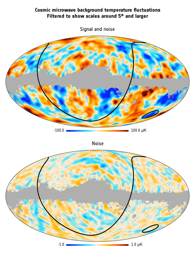 These anomalies appeared at large angular scales and indicated that the signal coming from certain regions of the CMB were about ten percent weaker than what the standard model of cosmology predicts. This was particularly the case in the two opposite hemispheres of the sky and around the "Cold Spot" - a large region with an unusually steep temperature profile.