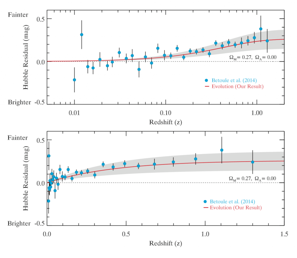 This is important. Because of the speed of light, when we look at distant galaxies we see younger galaxies. It takes billions of years for their light to reach us. If supernova evolution is true, then it throws off all of our distance measurements. Our measurements of cosmic acceleration and dark energy could be wrong. In fact, when the team compared their evolution model to the acceleration model, they found they gave the same result. Their evolution model removes the need for dark energy. What looks like an accelerating universe could be due to supernova evolution. If they are right, then dark energy might not exist.