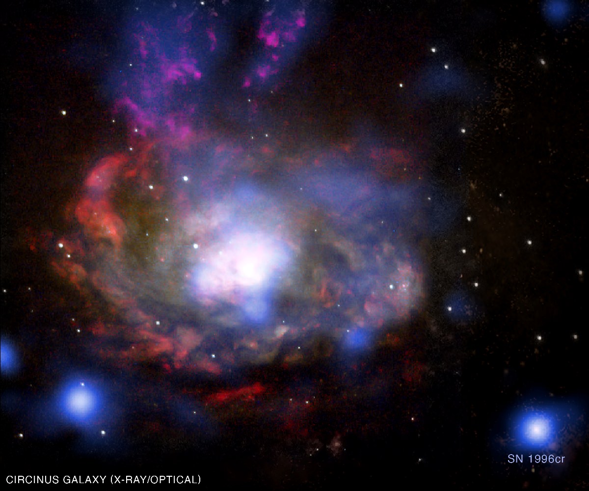 This composite image shows the central regions of the nearby Circinus galaxy, located about 12 million light years away. Data from NASA's Chandra X-ray Observatory is shown in blue and data from the Hubble Space telescope is shown in yellow, red, cyan, and light blue.[/caption]