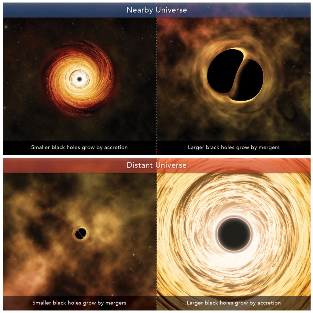 The new simulation shows that close to us, small black holes are growing mostly by accretion, while large black holes grow through mergers. But in the distant Universe, the reverse is true: small black holes grow through mergers, while large ones grow through accretion.