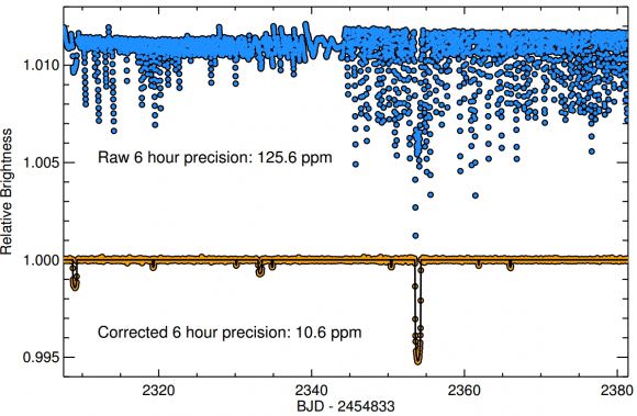 data by developing algorithms that attempt to compensate for the satellite's instability, which resulted from the mechanical failure that occurred in 2013. A member on the team, Martti H. Kristiansen, identified the five transits in diagrams subsequently produced by their pipeline. The image below conveys the raw and corrected data, whereupon