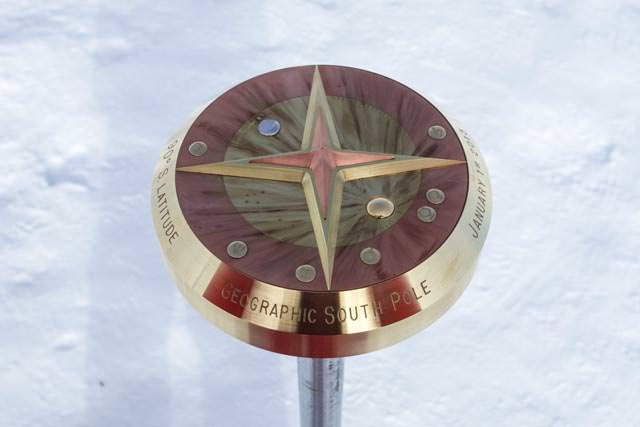 sits atop a layer of moving ice almost 2 miles thick, the location of the marker for the Earth's geographic South Pole needs to be relocated regularly. Tradition has this done on New Year's Day, and so this past January 1 saw the unveiling of the newest South Pole marker: a beautiful brass-and-copper design created by Station machinist Derek Aboltins.
