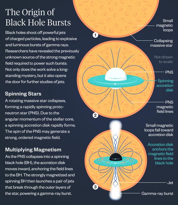 Black holes form from the collapse of proto-neutron stars, which are essentially what remains after massive stars have blown off their outer layers in a supernova explosion. While there have been a few theories about where black holes get their magnetism, none could account for the power of black hole jets or GRBs. Through their simulations, the team initially planned to study outflows from black holes, including the jets that produce GRBs. However, as Gottlieb's explained in a Simons Foundation press release, the team ran into a problem with the models: