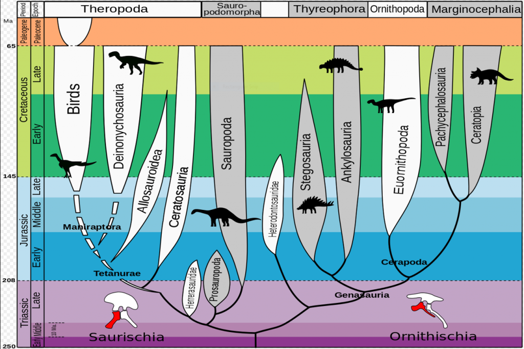 The Dinosaur Family Tree. Image: By Evolution_of_dinosaurs_by_Zureks.svg: Zureksderivative work: Woudloper (talk) - Evolution_of_dinosaurs_by_Zureks.svg, CC BY-SA 3.0, https://commons.wikimedia.org/w/index.php?curid=6321464[/caption]