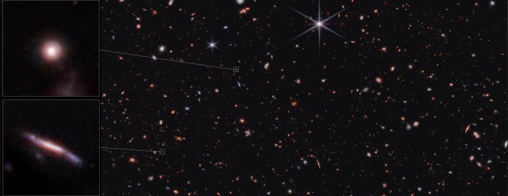 This is known as a "diffraction spike," an artifact only visible around very bright and compact objects that arises from the design of a telescope's mirrors. In this case, the six diffraction spikes extending from the center are due to the hexagonal symmetry of Webb's eighteen primary mirror segments. Astronomers are particularly interested in star-forming regions because their chemical composition resembles that of nebulas observed when the Universe was only a few billion years old.