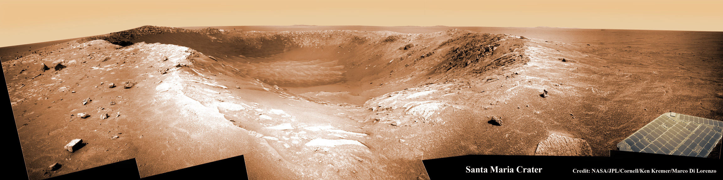 [caption id="attachment_82106" align="aligncenter" width="580" caption="Santa Maria from Palos Promontory on Mars. Opportunity drove to within 2.5 meters of the rim and snapped this gorgeous panoramic vista unveiling the whole interior on Sols 2453 & 2454. Note the steep walls and sand dunes on the floor. Mosaic Credit: NASA/JPL/Cornell, James Canvin"]