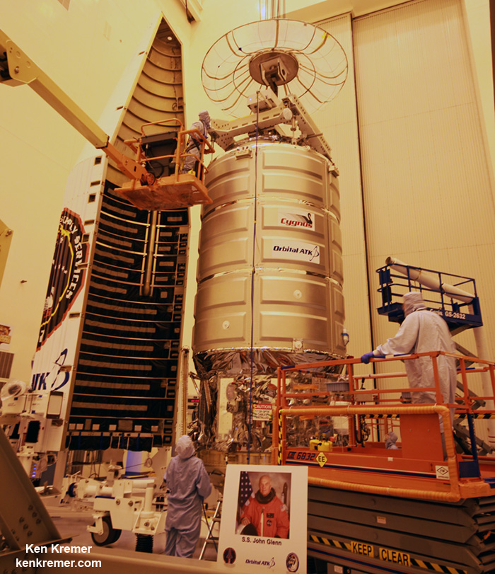 The next Orbital ATK Cygnus supply ship was christened the SS John Glenn in honor of Sen. John Glenn, one of NASA's original seven astronauts as it stands inside the Payload Hazardous Servicing Facility at NASA's Kennedy Space Center on March 9, 2017. Launch slated for March 21 on a ULA Atlas V. Credit: Ken Kremer/Kenkremer.com
