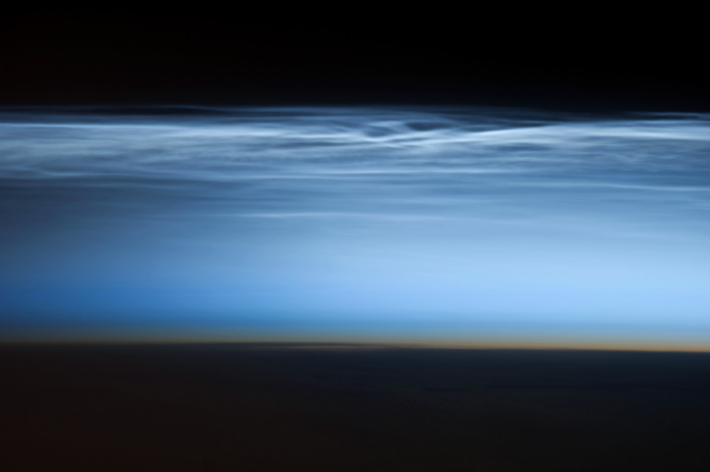 Noctilucent clouds, also known as "night shining" clouds imaged by Chris Hadfield. Image credit: NASA