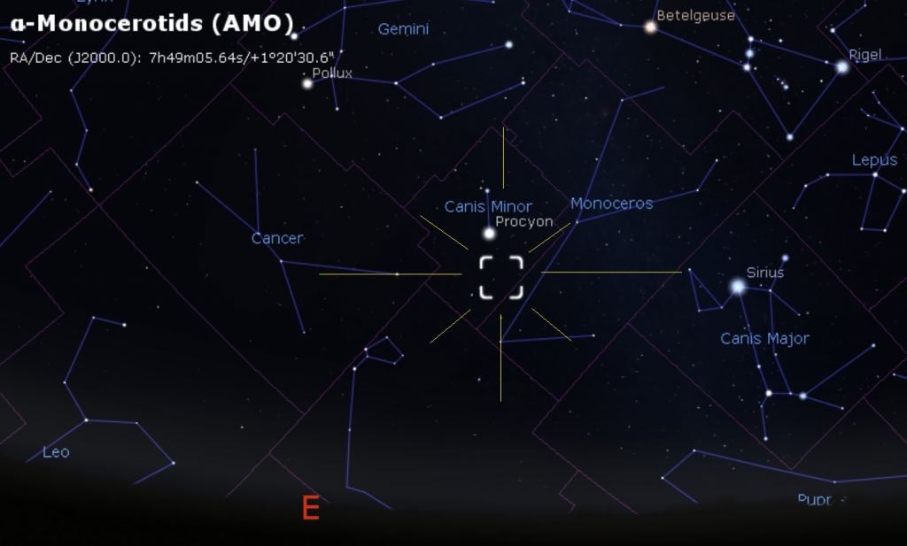 Next up, is a complete wildcard meteor shower, that may or may not perform in 2019: the Alpha Monocerotids. This elusive shower hails from the rambling constellation of Monoceros the Unicorn, (or do you say Narwhal?) with a radiant near +0.4thmagnitude Procyon, actually just across the border near Monoceros in the constellation Canis Minor (actually, the shower should be known as the Canis Minorids!).