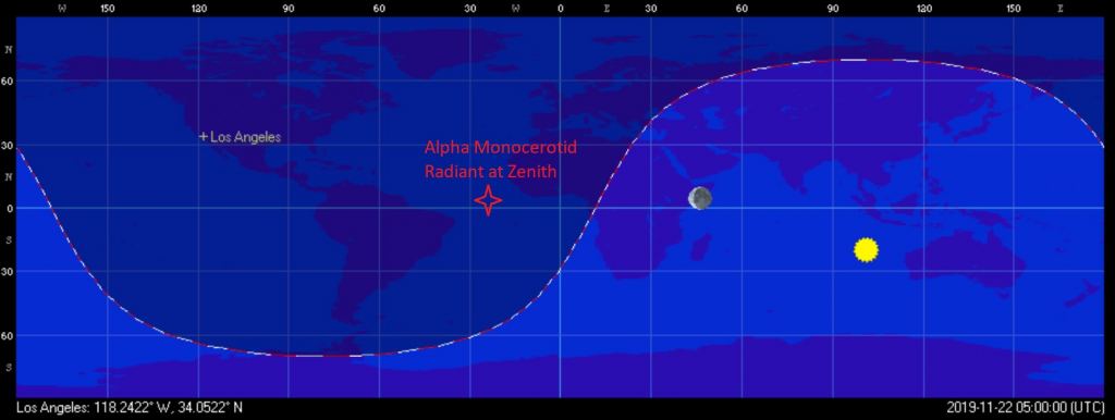 In 2019, the Alpha Monocerotids are expected to peak on the morning of November 22ndat around 5:00 UT, favoring European longitudes with a swift peak of perhaps 30-40 minutes in duration. North Americans should also be vigiliant on the morning of Friday November 22ndif skies are clear; meteor showers don't read predictions, and often show up early (or late). The Moon is also just four days prior to New phase, another plus. The exact source of the Alpha Monocerotids is a mystery, though it was once thought to be Comet C/1943 W1 van Gent-Peltier-Daimaca.