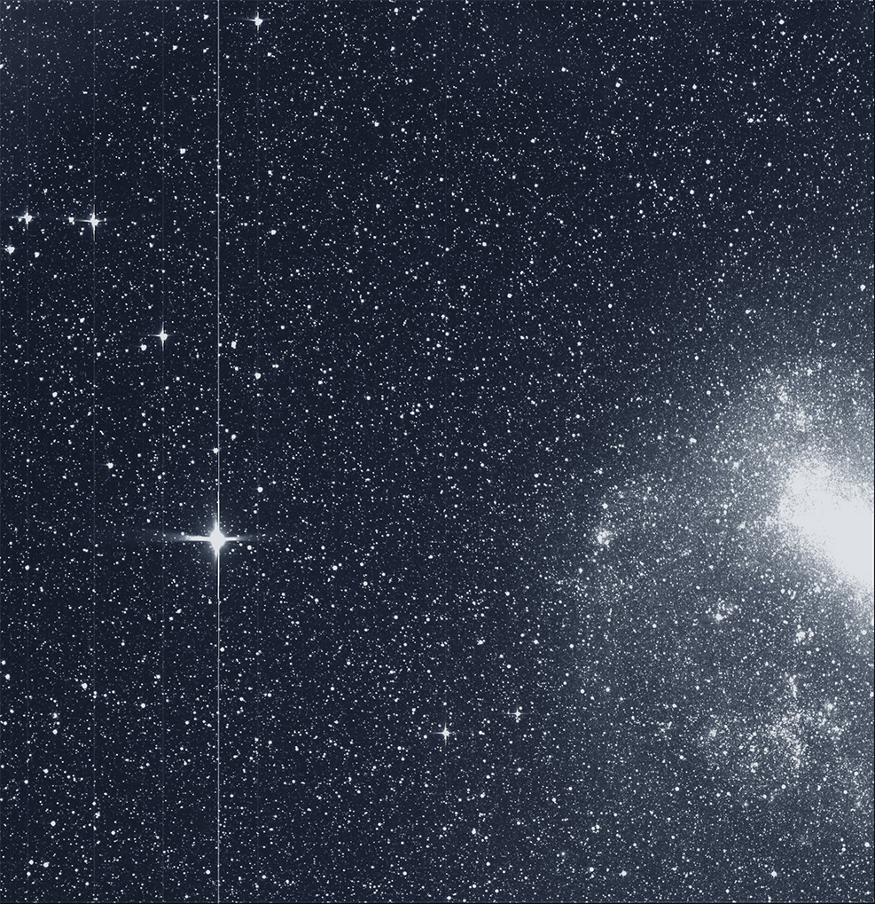 This is TESS's First Light image. On the left is the star R Doradus, and on the right is the Large Magellanic Cloud. Image: By NASA/MIT/TESS[/caption]