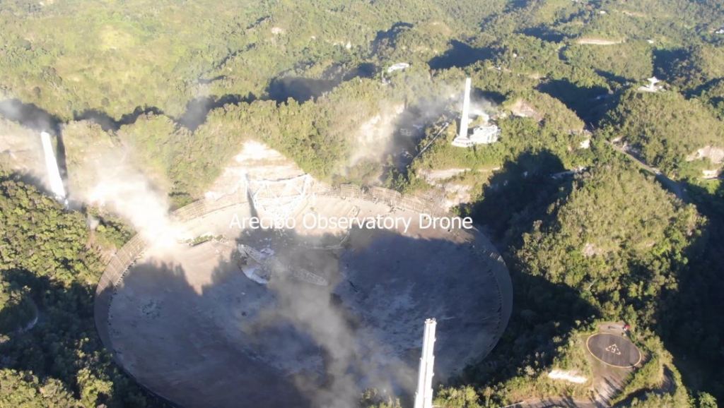 In a press briefing on December 3, representatives from the NSF described the two videos. One was taken from a stationary location in the observatory control room, and the other video was taken by a drone that was flying over the observatory to inspect cables and towers.