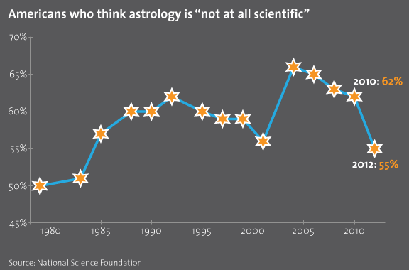 Their most recent survey showed that nearly half of all Americans (42 percent) believe astrology to be scientific. But what's more alarming, according to the NSF, is that American understandings of science are moving in the wrong direction. It seems our golden year was in 2004, when 66 percent of Americans said astrology was not at all scientific. That number has been dropping ever since.