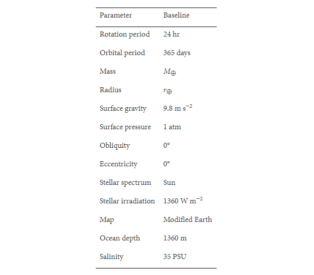 The baseline for all this modeling was an analog to Earth in many ways. The simulated planet had the same mass, radius, and surface gravity as Earth. The planet's star was Sun-like, and the day length and year length matched Earth's. The planet received the same stellar irradiation as Earth, but their Earth simulacra lacked the real Earth's obliquity and eccentricity, for simplicity.