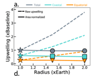 The team also modelled the planet's radius, though never in isolation. Radius was always changed along with mass, gravity, and surface pressure. The researchers found that on a global scale, upwelling increases with increased radius. It's a bit tricky though, and as they write in their paper, "... we note that this trend is eliminated when global upwelling is normalized to surface area which increases as r 2(Figure 7 (a), solid lines). In other words, upwelling per unit area is nearly constant despite an absolute increase in the global sum on larger planets."