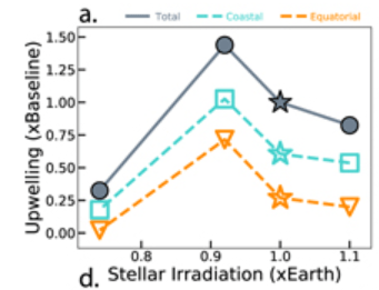 Upwelling also changed as a result of varying stellar irradiation. Up to a point, decreasing irradiation led to increased upwelling. Until sea ice approaches 100%, then upwelling drops off.